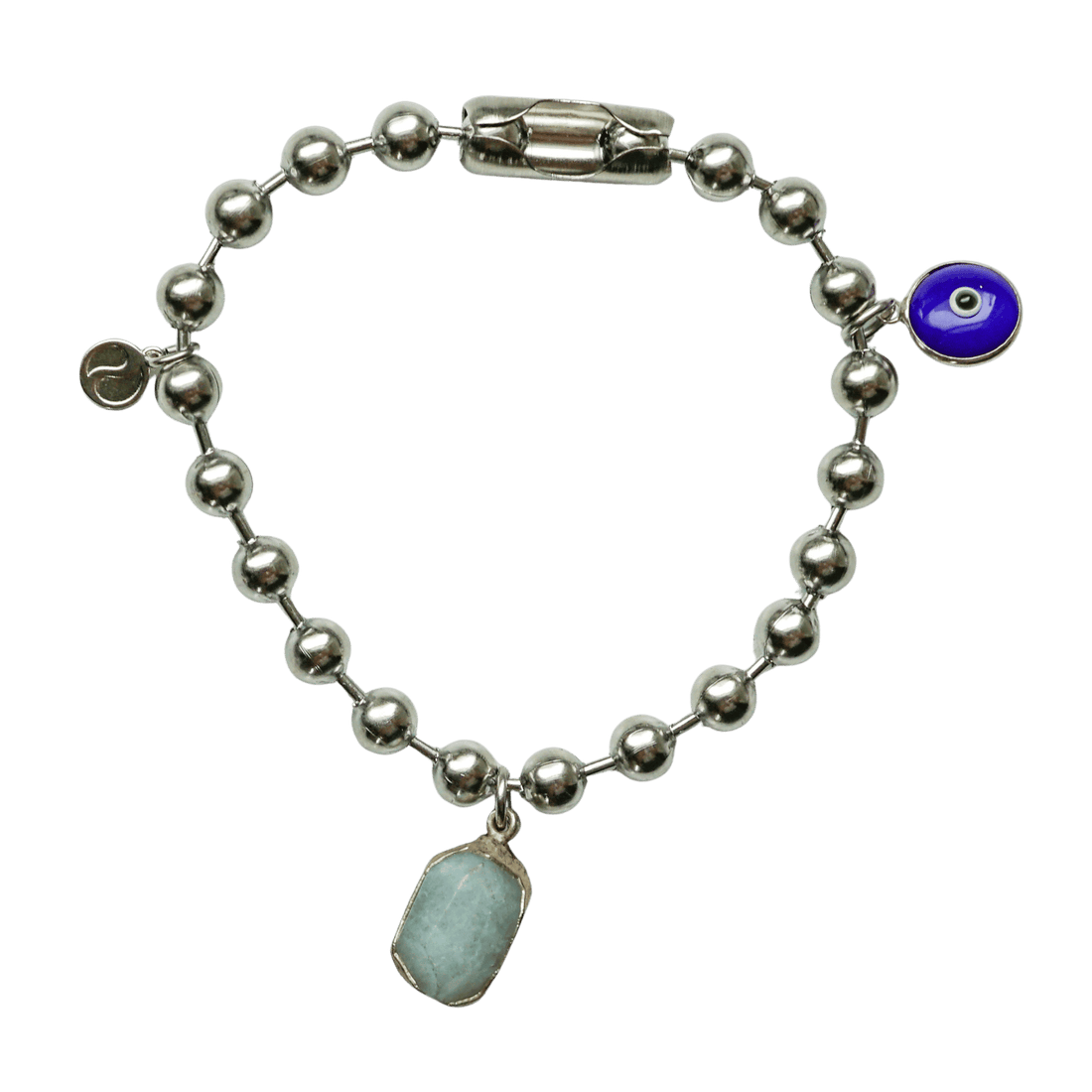 Silver Charm Bracelet with Aquamarine & Blue Evil Eye