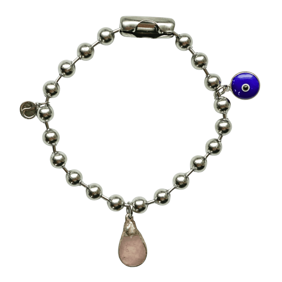 Silver Charm Bracelet with Rose Quartz & Blue Evil Eye