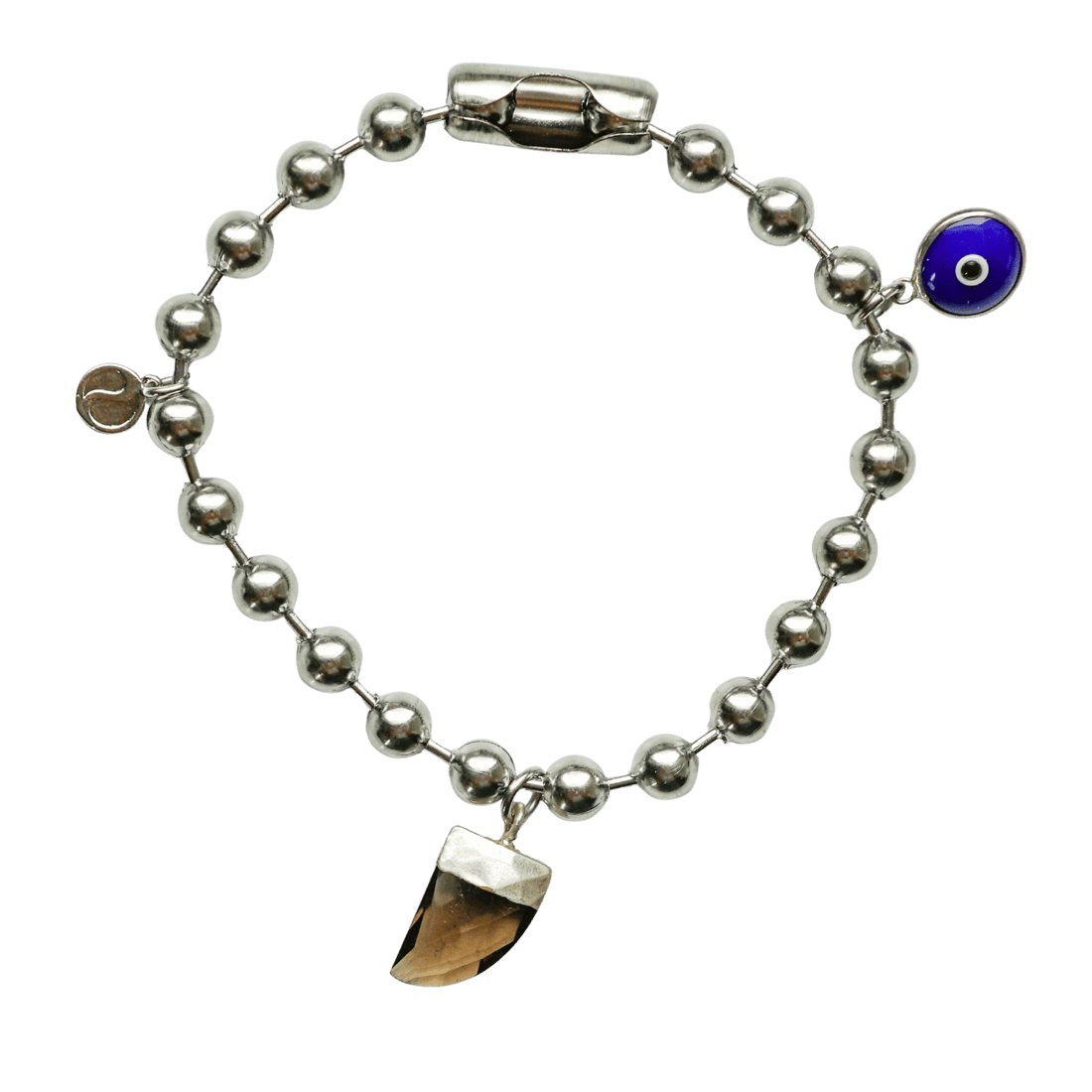Silver Charm Bracelet with Smoky Quartz & Blue Evil Eye