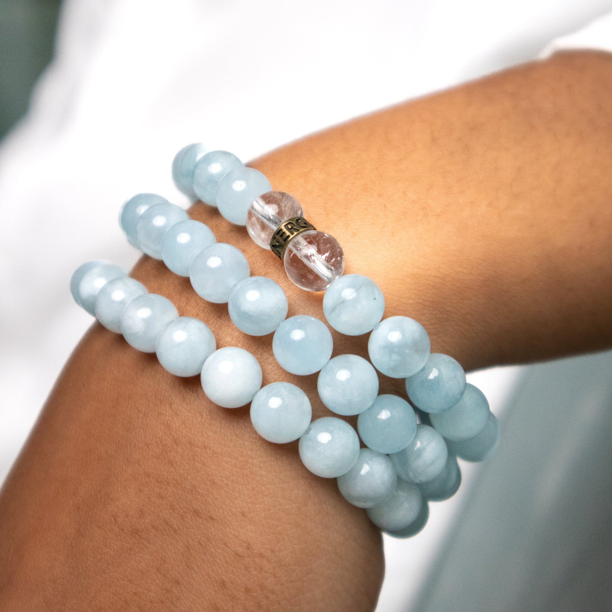 Harmony: Aquamarine crystals are renowned for their ability to bring harmony into your life. Just like the tranquil ocean waves, the soothing blue-green hues of Aquamarine exude a calming energy that resonates with the throat chakra. By adorning your wrist with this bracelet, you invite harmonious communication, inner peace, and balance. It acts as a gentle reminder to express yourself with grace and clarity.