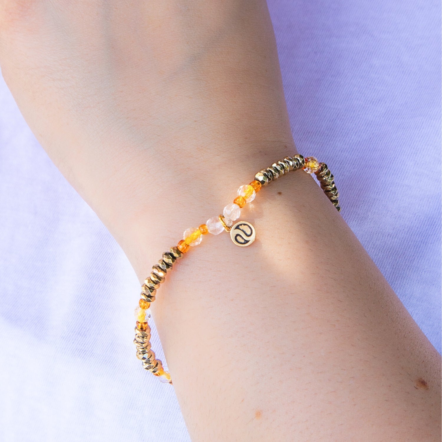 Complementing Pyrite's robust energy, Citrine brings a radiant glow to your life. This sunny stone is synonymous with prosperity, light, positivity, and hopefulness. It's like having a piece of sunlight on your wrist, constantly reminding you to look for the silver (or golden) lining in every situation. Citrine's uplifting energy not only attracts financial abundance but also serves as a beacon of optimism and joy.